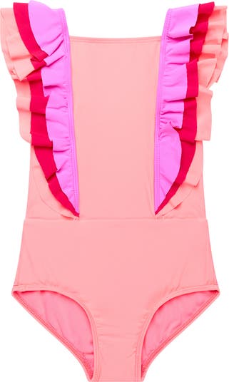 Colorful contrasting ruffles bring playful movement to this adorable swimsuit that they'll love to wear during their next pool day.