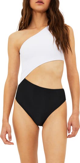 A waist-baring cutout adds alluring detail to a cheeky one-piece swimsuit complete with bold colorblocking.