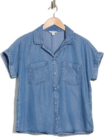 Fresh, airy chambray and a boxy, softly oversized silhouette dial up the resort-ready vibe of this camp shirt flanked by twin chest pockets.