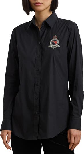 A beaded logo crest adds regal flair to this silky-soft cotton-blend button-up shirt.