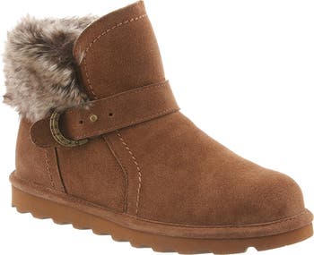 - - Round toe - Side buckle detail - Faux fur lining - Suede or wool construction - Approx. 5" shaft height, 11" opening circumference - Imported