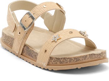 Rhinestone-embellished gleaming accents bring extra cuteness to this tot-and kid-approved double-strap sandal perfect for stylish little steps.