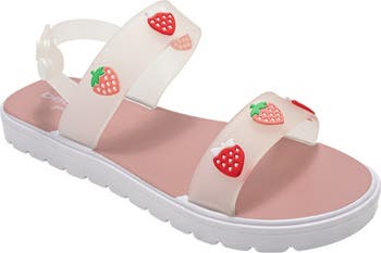 Strawberry accents bring extra cuteness to this walker-and tot-approved ankle strap sandal perfect for stylish little steps.