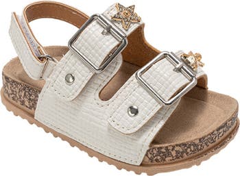 Gleaming and crystal-covered accents add extra cuteness to this walker-and tot-approved double strap sandal perfect for stylish little steps.
