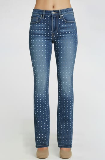 Dainty rhinestones add a festive finish over the fading and whiskering of straight-leg jeans with streetwise appeal.