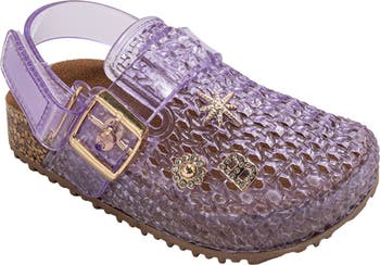 This lightweight jelly clog provides gentle support for all‑day comfort and features a secure buckle strap, playful charm accents and a closed‑toe design that helps protect little toes from bumps and scrapes.