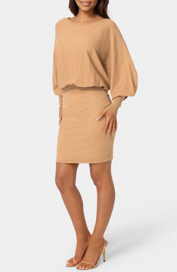 Voluminous dolman sleeves and a blouson bodice bring dimension to this rib-knit sweater dress shaped in a curve-hugging silhouette.