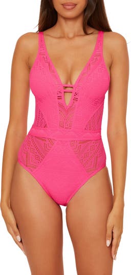 Stretch-hinted lace—left peekaboo sheer in just the right places—creates an hourglass shape on this plunge-neck swimsuit.
