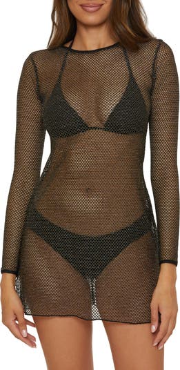 Sheer mesh brings texture to this cover-up tunic with shiny metallic threads and long sleeves.