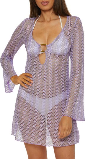 An airy open knit lace and plunging keyhole neckline with golden hardware bring mod appeal to this sheer cover-up tunic.