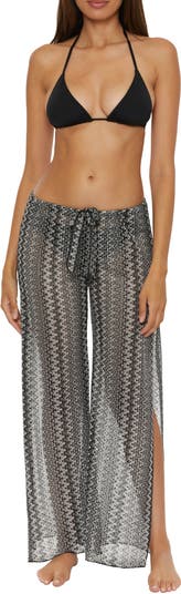 Shimmering yarns bring beach-ready color to breezy cover-up pants that flow freely with dual side slits.