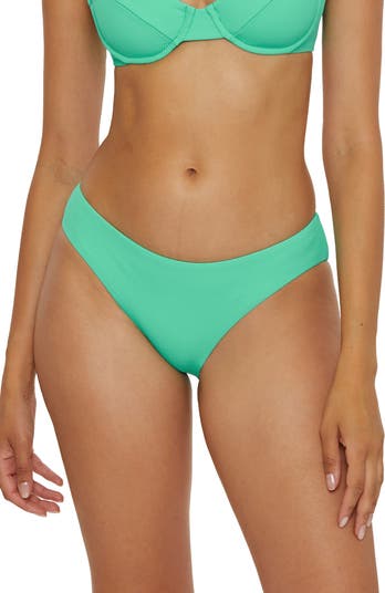 Soft ribbing detail classic hipster bikini bottoms fashioned with a shirred design at the moderately covered back.