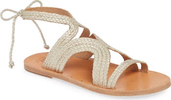 A shimmery metallic finish beautifully plays up the hand-braided design of a strappy leather sandal secured at the ankle with slim knotted ties.