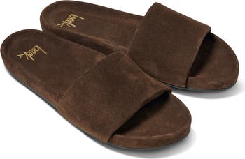 A molded memory foam footbed cradles each step in this luxe slide sandal composed of leather with a versatile finish.
