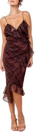 Flirty ruffles gracefully cascade down this midi-length dress covered in wine-hued plaid and hung from slender straps.