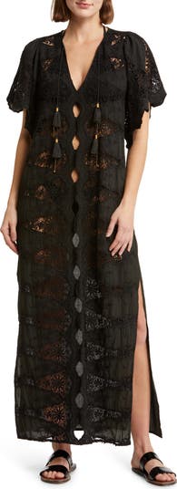 Side slits and openwork lace lend breezy energy to this cotton cover-up kaftan with cutouts down the front.