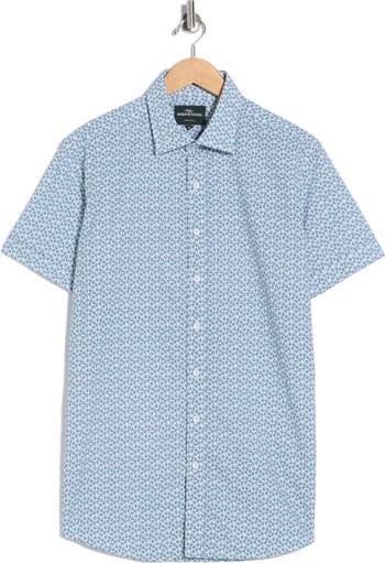 A micro leaf print enhances the sunny-day vibe of this short-sleeve button-up shirt cut from a breathable cotton blend for daylong comfort.
