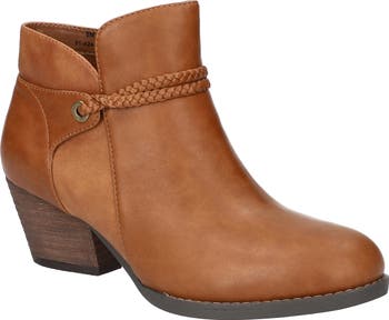 Braided instep straps and mixed textures add modern intrigue on a versatile bootie grounded by a cushioned footbed and stacked heel.