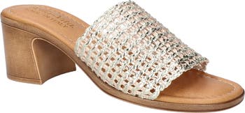 A woven upper creates a boho aesthetic on a slide sandal balanced by a round toe and chunky block heel.