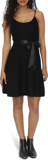 Vertical seams and a circle skirt lend graceful movement to this supersoft knit dress accented by a satin, bow-tied waist belt and adjustable shoulder straps for a secure fit.
