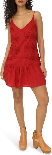 Textured appliques and a drop-waist skirt bring vintage-inspired flair to this tank dress framed by a V-neckline and adjustable shoulder straps for a custom fit.