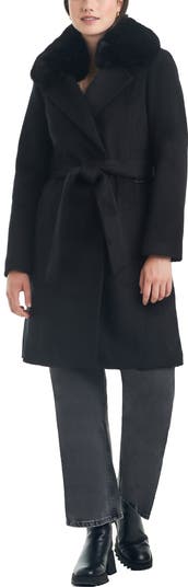 A wool-kissed coat features a couple of ways to switch up the look from the optional sash to the detachable faux fur collar.