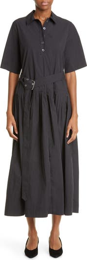 A button half-placket and utility-inspired belt underscore the relaxed aesthetic of a cotton-blend shirtdress designed with a voluminous pleated skirt.