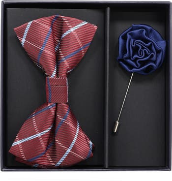 Turn up the sophistication of your formalwear with this coordinating set of a check-patterned satin bow-tie complimented by a rosette lapel pin.