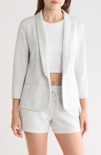An open-front silhouette brings classic charm to this scuba-knit blazer styled with a shawl collar.