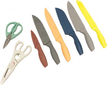 Add some color to your kitchen with this knife set, with 6 knives and 2 pairs of scissors you can chop, dice, and slice to your hearts content! All the knives and one pair of scissors include matching sheath to keep your knives sharp and to keep you safe.