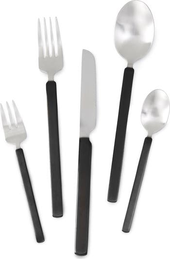 Ergonomic handles and a polished finish distinguish this contemporary flatware set that adds subtle elegance to your table setting. Each place setting includes a dinner knife, dinner fork, salad fork, soup spoon and teaspoon.