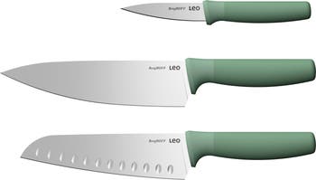 Chop, mince, and dice like a top chef with this set of high-quality stainless steel knives finished with colorful, ergonomic handles made from recycled plastic.