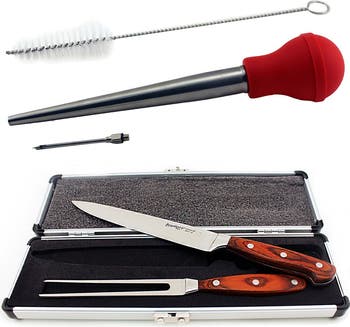 Pakka's 3pc Carving set has triple-riveted wood handle ensures superior balance and comfort. The carving-style blade makes cutting meat and poultry effortless. Forged of high-carbon stainless steel. This quality baster by BergHOFF was crafted from surgical-grade stainless steel for long-lasting use. The all-in-one set comes with a cleaning brush for those hard to reach spots and a bulb that removes easily, making clean up a breeze. Use the stainless needle for tenderizing and adding flavor to meats and poultry or the bulb applicator for maintaining moisture in your meals. Ideal for roasting, barbequing, or smoking cooking methods. - Set of 6 - Imported Set includes: - 6" carving fork - 8" carving knife - 14" x 4" aluminum storage case - 1x baster - 1x baster cleaning brush - 1x injector Orders cannot be shipped to Canada, Puerto Rico, APO, FPO or P.O. Boxes.