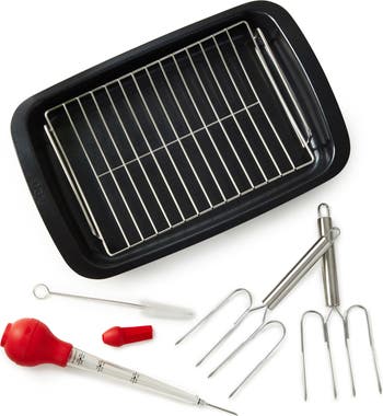 - Set includes tray, slotted tray, basting brush, baster and two forks