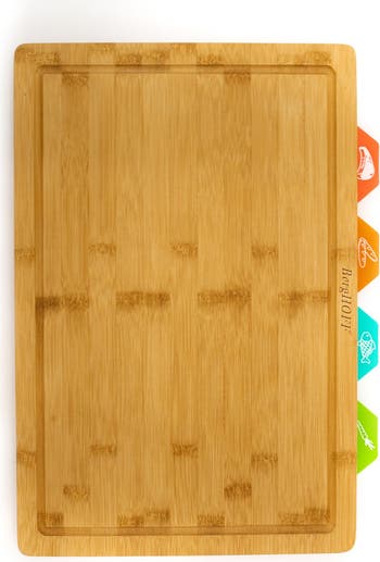The 5pc Chopping Board Set offers the natural beauty of bamboo and couples it with color-coded accessory boards that fit inside the larger bamboo board for easy storage and accessibility. Color coding assists in avoiding cross-contamination while preparing meals.