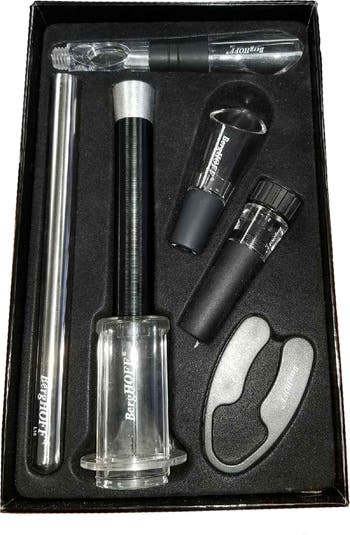 Keep things cookin' and cute with this fab kitchen tool. - 5-Piece Set - Color: Black - 6" x 9.75" x 2.5" overall - Imported Set includes: - Air pump opener - Foil cutter - Stopper - Aerator pourer - Chiller pourer Orders cannot be shipped to Canada, Puerto Rico, APO, FPO or P.O. Boxes.