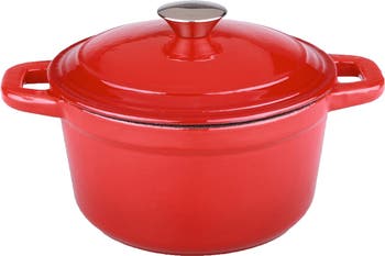 Cast iron has great heat retaining abilities and can be used on any heat source. Classic in a modern design, solid material for all your cooking needs! - Cast iron construction - Oven safe up to 400 degrees F - 7 Qt. capacity - Color: red - Approx. 10.8" W x 10.8" L x 5" D - Imported Orders cannot be shipped to Canada, Puerto Rico, APO, FPO or P.O. Boxes.