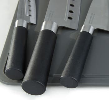 Elevate your cooking experience with our Santoku Knife Set, a kitchen essential designed for precision and ease. Strategically placed holes create air pockets to prevent food from sticking, while the scalloped Santoku knife enhances versatility for effortless slicing and dicing.