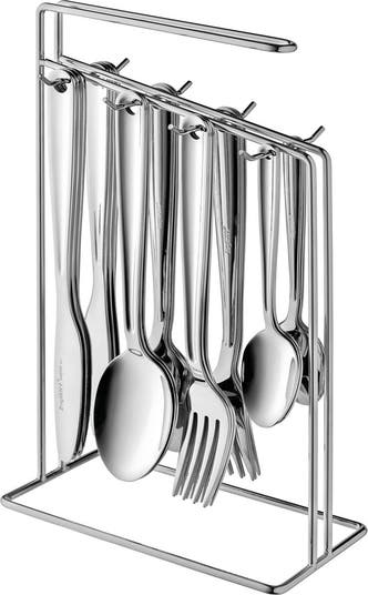 - - Color: silver - Approx. 6.25" x 4" x 10.75" - Imported Set includes: - 6 x 8.75" dinner knives - 6 x 8" dinner forks - 6 x 8" dinner spoons - 6 x 5.75" dessert spoons - 1 x stand