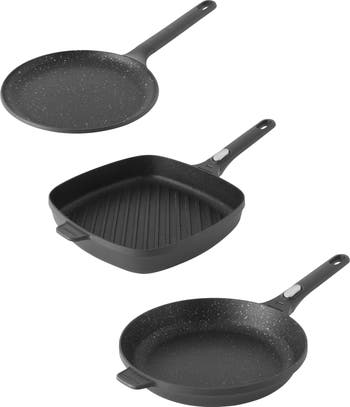 BergHOFF's Gem 3-piece Nonstick Cookware Set comes with components essential to any kitchen. Set includes one 11.25" frying pan with removable handle, one 11.25" grill pan with removable handle, and one 9.75" pancake pan. The multi-purpose frying pan is the perfect size for preparing breakfast, lunch, or dinner. Make endless pancakes, decadent crepes, gooey grilled cheese sandwiches, fluffly omlettes, steaks, french fries and more. Prefer a cafe style meal at home? Use the grill pan to get those perfect grill marks on chicken, steak, or even grilled cheese sandwiches. Our Gem cookware is made from high-quality cast aluminum with a PFOA free, non-toxic Ferno Green nonstick coating our Gem cookware performs well every time. Easy release of even the most delicate foods.