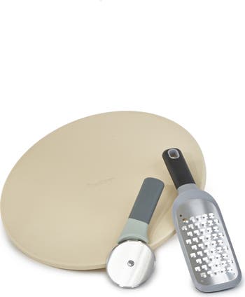 Sizing information: Pizza stone is 14" diameter; cutter is 7.5" long; grater is 10.75" long.