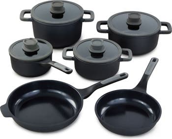 Includes: 4.6-quart stockpot, 5.9-quart stockpot, 2.1-quart saucepan, 5-quart sauté pan, 10-inch fry pan, 11-inch fry pan, 4 lids