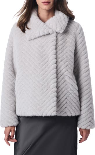 Elevate your cool-weather look with this plush faux-fur jacket textured with chevron quilting and topped with an oversized notched collar that converts to a neck- and ear-warming stand collar.
