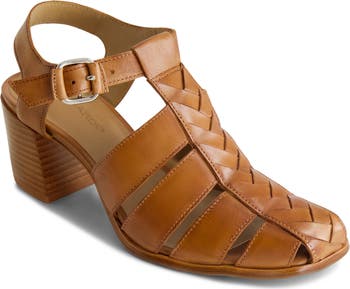 A braided center strap details the fisherman-inspired silhouette of this sandal balanced upon a stacked block heel.