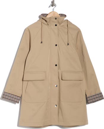 Brand-signature plaid trim on the cuffs and hood of a rain coat bring a touch of cheer to your cold-weather looks.