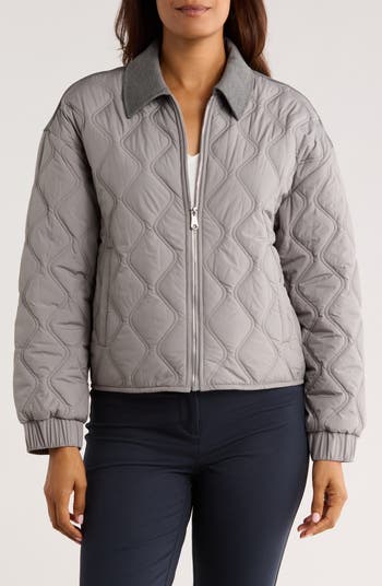 A combination of twill panels and onion quilting define a mixed-media jacket that adds a lightweight layer of warmth to chilly-day looks.