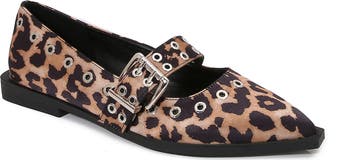 Polished buckle hardware and rows of grommets shimmer and shine with every step you take in a cushy mary-jane flat elongated by a pointy toe.