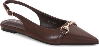 Polished bit hardware shines brightly at the pointy-toe vamp of a slingback flat crafted from smooth faux leather.
