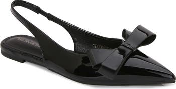 A voluminous bow tops the pointed toe of a sleek patent flat fashioned with an elasticized slingback strap for easy entry.