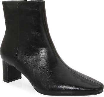 A crinkled texture enriches the faux-leather construction of a bootie set on a wrapped block heel that's easy to walk on.